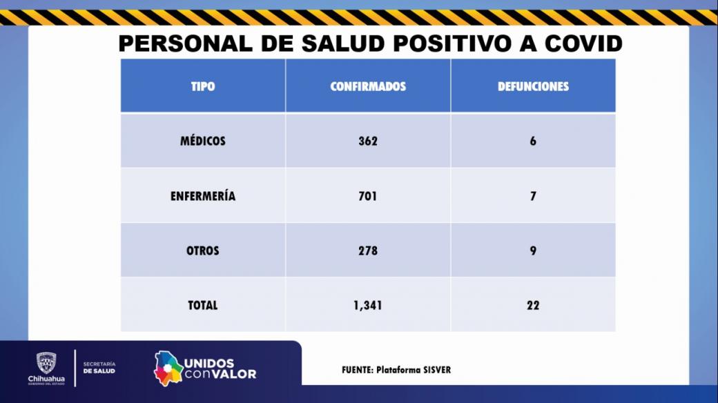 Durante la conferencia informativa número 188 (146 virtual) de la Secretaría de Salud del Gobierno del Estado de Chihuahua, dio a conocer que en total hay 1 mil 341 elementos del sector, que han sido confirmados como positivos a esa enfermedad.