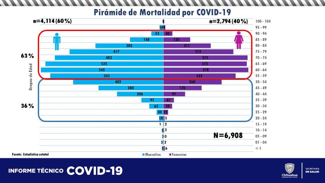 Mientras que el total de personas fallecidas es de 6 mil 908, en donde el 40% han sido mujeres, esto es 2,763 y el 60% hombres, 4,146. No se registraron decesos en el último reporte.