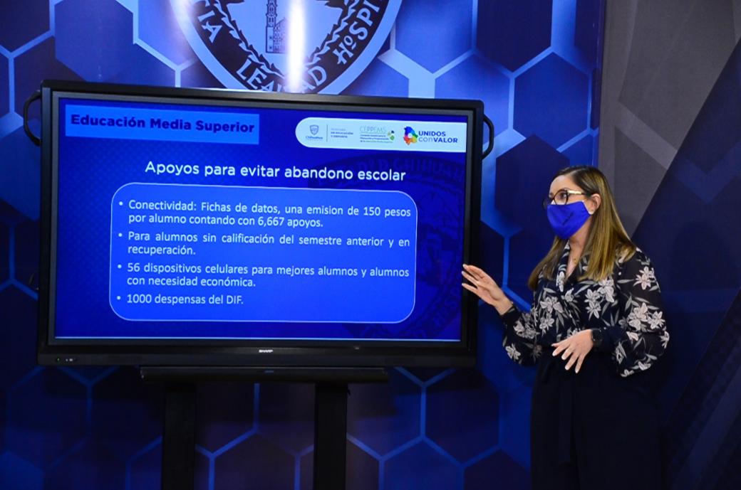 Además, Liliana Rojero, señaló que Gobierno del Estado otorga apoyos de índole económico a quienes no tienen una calificación del semestre anterior y que actualmente están tomando cursos de recuperación, 150 pesos en datos a los celulares que tienen inscritos en sus planteles, o al del padre de familia, para que puedan continuar en comunicación con la escuela durante el mes de recuperación escolar y que logren regularizarse e ingresar al próximo semestre.