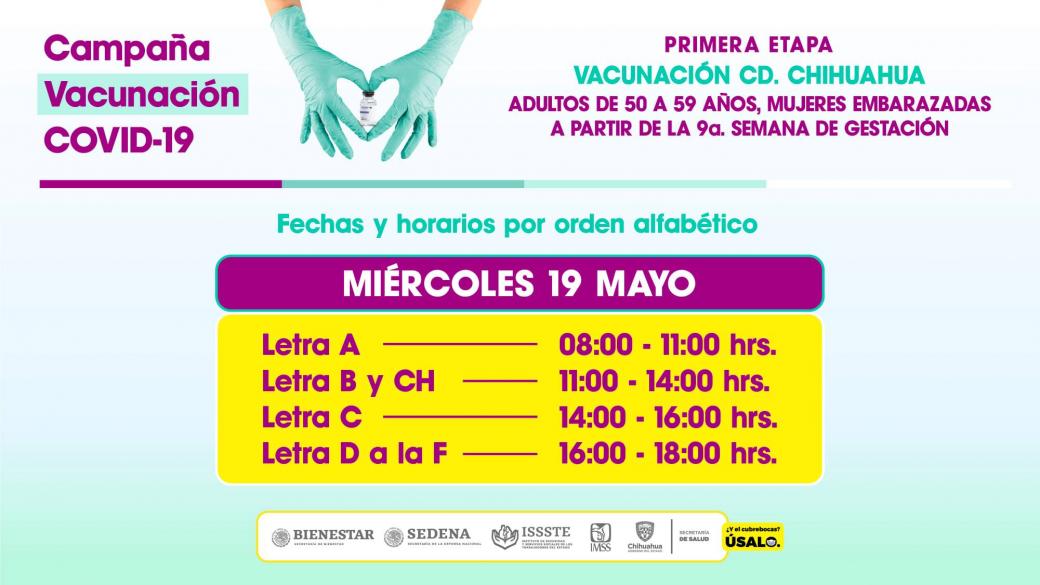 El miércoles 19 de mayo se vacunará a las personas cuyo apellido inicie de las letras A a la F. Quienes se apelliden con la letra A de 8:00 a las 11:00 horas, las letras B a la Ch de las 11:00 a las 14:00 horas, la C de las 14:00 a las 16:00 horas y de la D a la F de 16:00 a las 18:00 horas.