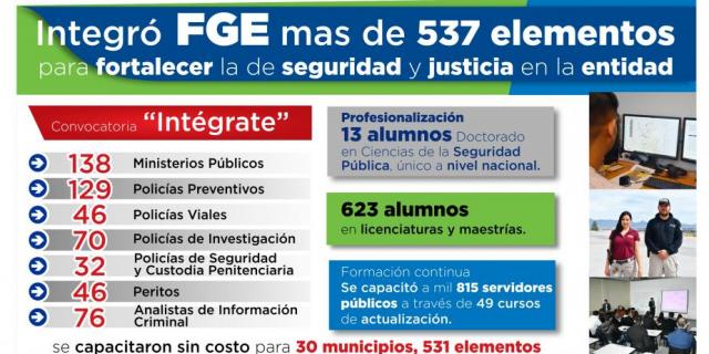 La Fiscalía General del Estado (FGE) de Chihuahua informó que durante 2019 se sumaron 537 hombres y mujeres a los cuerpos operativos, como resultado de la convocatoria Intégrate hecha a través del Instituto Estatal de Seguridad Pública (IESP).