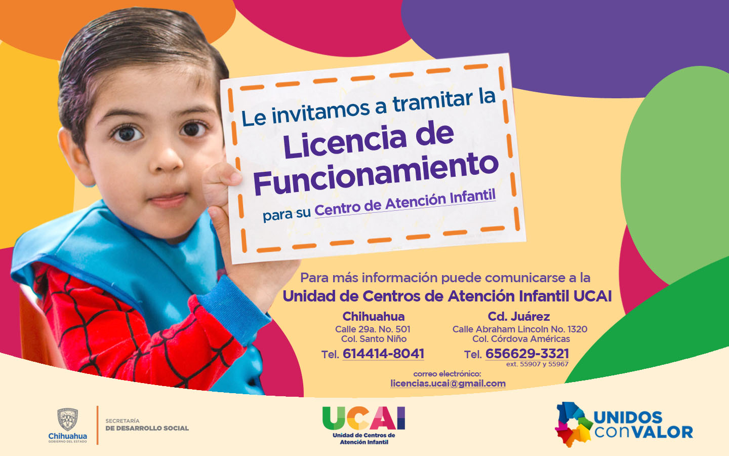 Con el objetivo de garantizar la seguridad y derechos de las niñas y los niños y que sean atendidos en espacios de cuidado óptimos en todo el estado de Chihuahua, la Secretaría de Desarrollo Social, a través de la Unidad de Centros de Atención Infantil (UCAI), invita a las personas responsables de estos centros a tramitar su licencia de funcionamiento.
