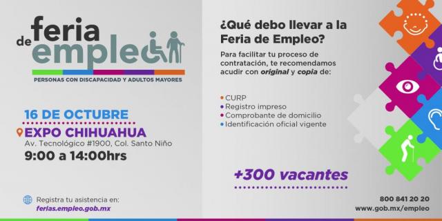 El Gobierno del Estado, a través de la Secretaría del Trabajo y Previsión Social (STPS), invita a las y los chihuahuenses a la Feria de Empleo para Personas con Discapacidad y Adultos Mayores, que se realizará este 16 de octubre en las instalaciones de Expo Chihuahua de la capital del estado.