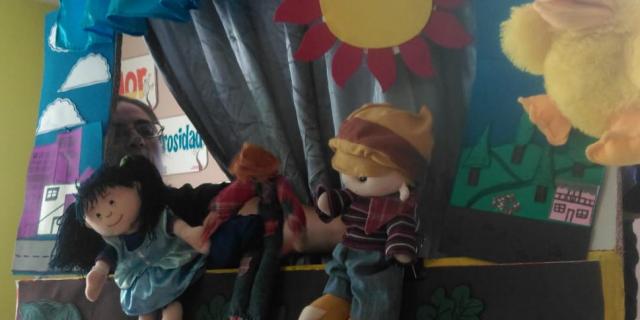 En esta experiencia, las y los niños disfrutan de la presentación del Teatro Guiñol con el del cuento María y Tomás, mediante el cual se invita al cuidado del planeta y a la producción de alimentos saludables en armonía con los ecosistemas.