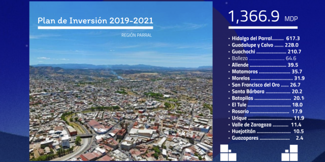 Más de mil 366 millones de pesos destinará el Plan de Inversión Chihuahua 2019-2021 para la región de Parral que comprende 16 municipios, algunos ubicados en la sierra.