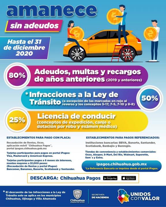 En recaudación de rentas, el descuento es del 80 por ciento, aplica en adeudos, multas y recargos de años anteriores (2019 y anteriores), mismos que también se ven reflejados al momento de pagar en medios alternos o a través de la página ipagos.chihuahua.gob.mx
