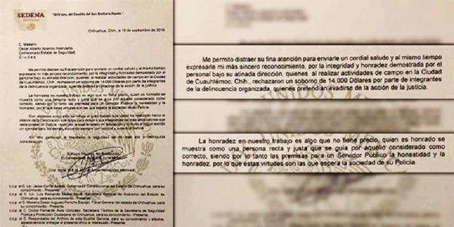 En documento oficial, la Secretaría de la Defensa Nacional destaca el liderazgo y trabajo realizado al interior de la Comisión Estatal de Seguridad; detenido en Cuauhtémoc les ofrecía 14 mil dólares a cambio de su libertad