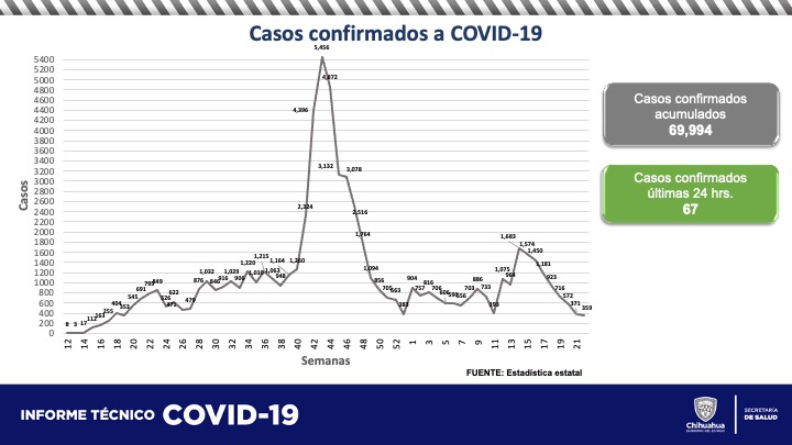 La dependencia en su informe, reveló además que ascienden en 67 los casos confirmados de SARS-CoV-2, con lo que llegó a 69 mil 994, la cifra de recuperados incrementó en 187, hay otros 49 descartados y 44 casos sospechosos.