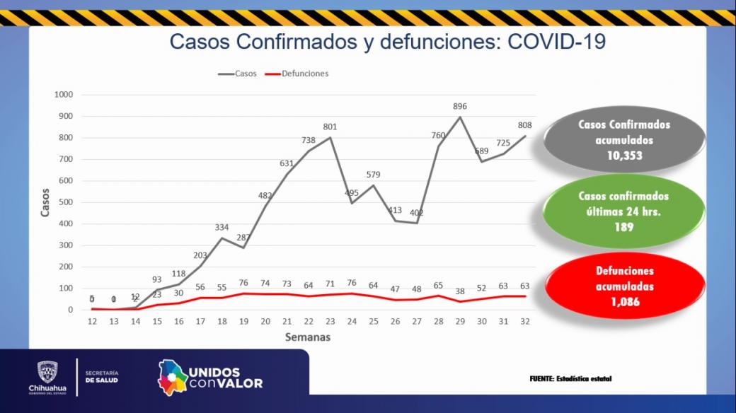El informe técnico de la pandemia indica que hay un acumulado de 10 mil 353 casos confirmados; se integran Namiquipa y Riva Palacio a la lista de municipios con fallecimientos