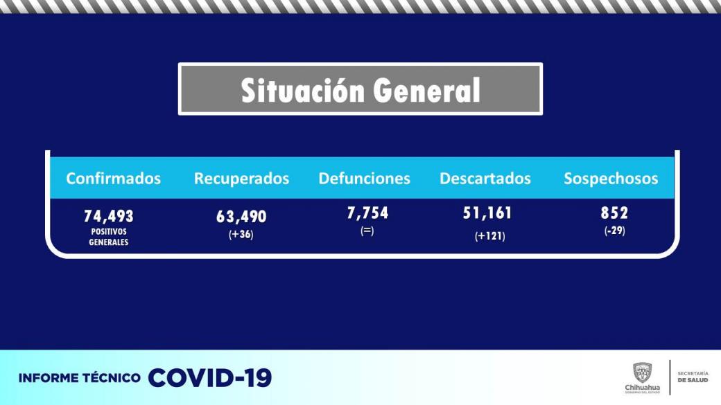 De esta manera, al 17 de agosto se tienen en el estado de Chihuahua un total general de 74,493 casos confirmados, 7,754 personas fallecidas, 63,490 recuperadas, 51,161 descartadas y 852 sospechosos.
