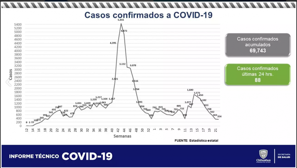 Los municipios con más casos acumulados son Juárez con 32 mil 211; Chihuahua con 20 mil 677, Parral con 2 mil 931, Cuauhtémoc con 2,659 y Delicias con 2 mil 470.