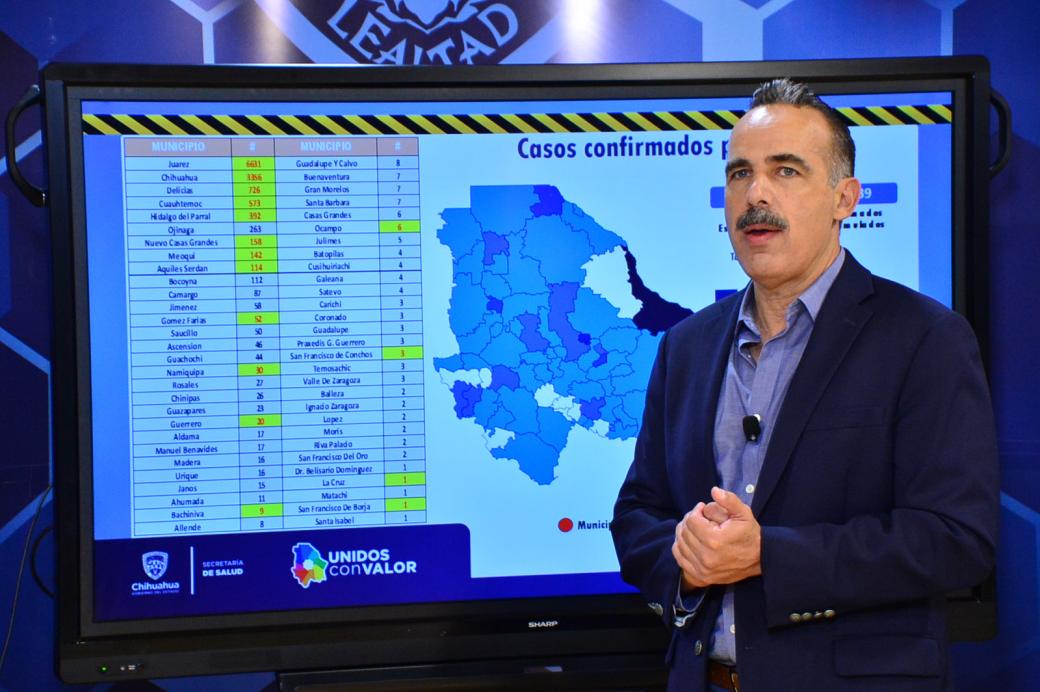 Casos por municipio: Ahumada 11, Aldama 17, Allende 8, Ascensión 46, Aquiles Serdán 114, Bachíniva 9, Batopilas 4, Bocoyna 112, Balleza 2, Buenaventura 7, Camargo 87, Carichí 3, Casas Grandes 6, Chihuahua 3,356, Chínipas 26, Coronado 3, Cuauhtémoc 573, Cusihuiriachi 4, Delicias 726, Galeana 4, Gómez Farías 52, Guachochi 44, Gran Morelos 7, Guadalupe 3, Guadalupe y Calvo 8, Guazapares 23 y Guerrero 20.