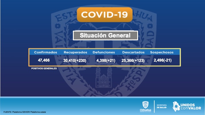 En el lapso de las últimas 24 horas, la pandemia de COVID-19 en Chihuahua ha ocasionado 4 mil 398 defunciones y 47 mil 466 contagios, dio a conocer la Secretaría de Salud estatal.
