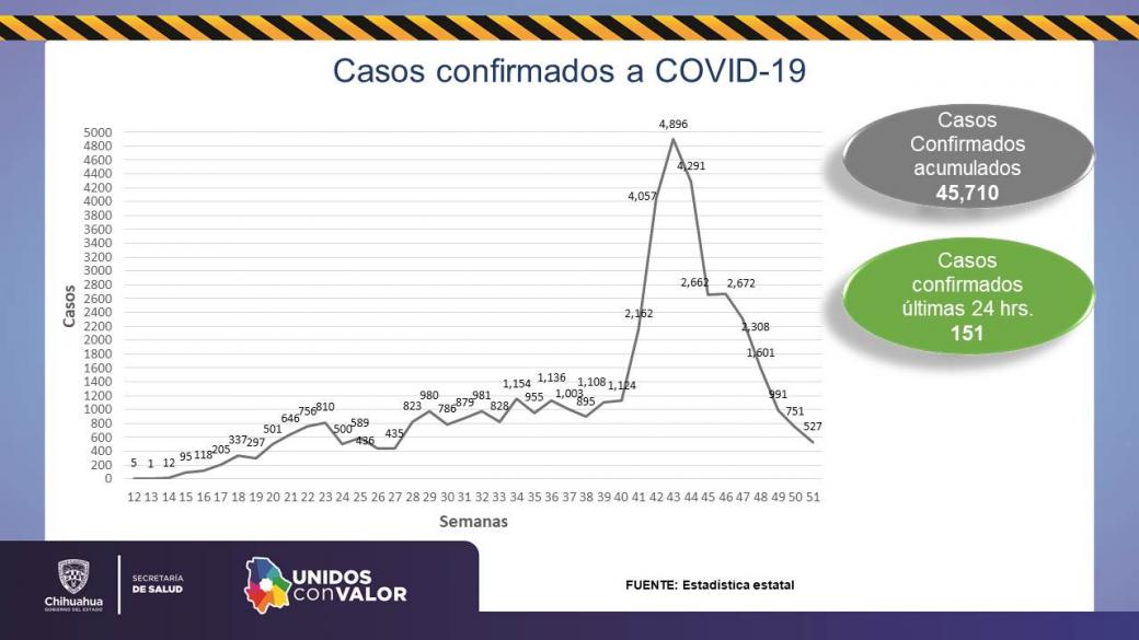 La Secretaría de Salud informa que en las últimas 24 horas, se tienen en el estado de Chihuahua un total general de 45 mil 710 casos confirmados de COVID-19 con 151 nuevos, mientras que el número de personas fallecidas es de 4 mil 208, ya que se sumaron 5 decesos.