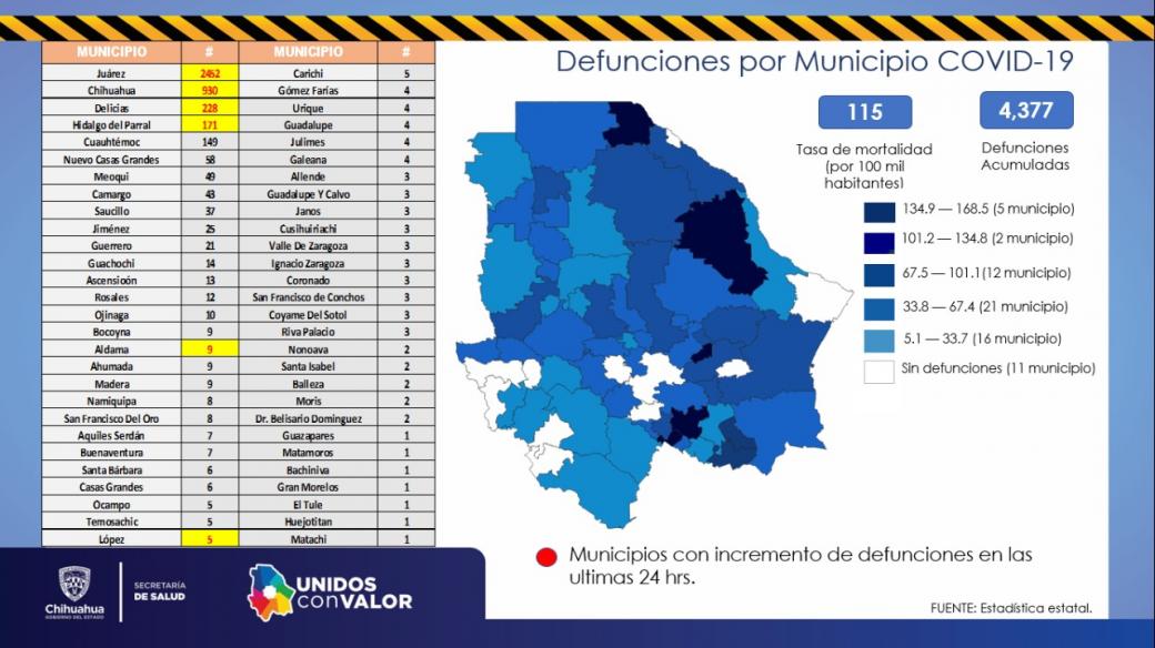 El número de personas fallecidas por COVID-19 en lo que va de la pandemia, llegó a 4 mil 377, que se distribuyen en 2 mil 452 Ciudad Juárez, 930 Chihuahua, 228 Delicias, 171 Parral, 149 Cuauhtémoc, 58 Nuevo Casas Grandes, 49 Meoqui, 43 Camargo, 35 Saucillo, 25 Jiménez, 21 Guerrero, 14 Guachochi, 13 Ascensión, 12 Rosales, 10 Ojinaga, 9 Ahumada, 9 Madera, 9 Bocoyna, 9 Aldama, 8 Namiquipa, 8 San Francisco del Oro, 7 Aquiles Serdán, 7 Buenaventura, 6 Casas Grandes, 6 Santa Bárbara, 5 Carichí, 5 Temósachic, 5 Ocampo, 4 Galeana, 4 Urique, 4 Gómez Farías, 4 Julimes, 4 Guadalupe, 5 López, 3 San Francisco de Conchos, 3 Riva Palacio, 3 Janos, 3 Coronado, 3 Allende, 3 Valle de Zaragoza, 3 Ignacio Zaragoza, 3 Cusihuiriachi, 3 Coyame, 3 Guadalupe y Calvo, 2 Belisario Domínguez, 2 Moris, 2 Nonoava, 2 Balleza, 2 Santa Isabel, 1 Matachí, 1 Bachíniva, 1 Guazapares, 1 Gran Morelos, 1 El Tule, 1 Huejotitán, y 1 Matamoros.