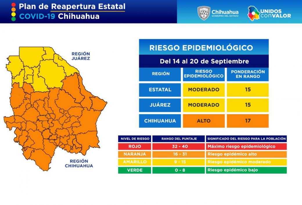 Dichos indicadores colocan al estado de Chihuahua en promedio con 15 puntos, por lo cual la entidad continuará en amarillo en la zona norte y en naranja en la región sur; Juárez presenta riesgo moderado pero en el límite, por lo que debe seguir como está.