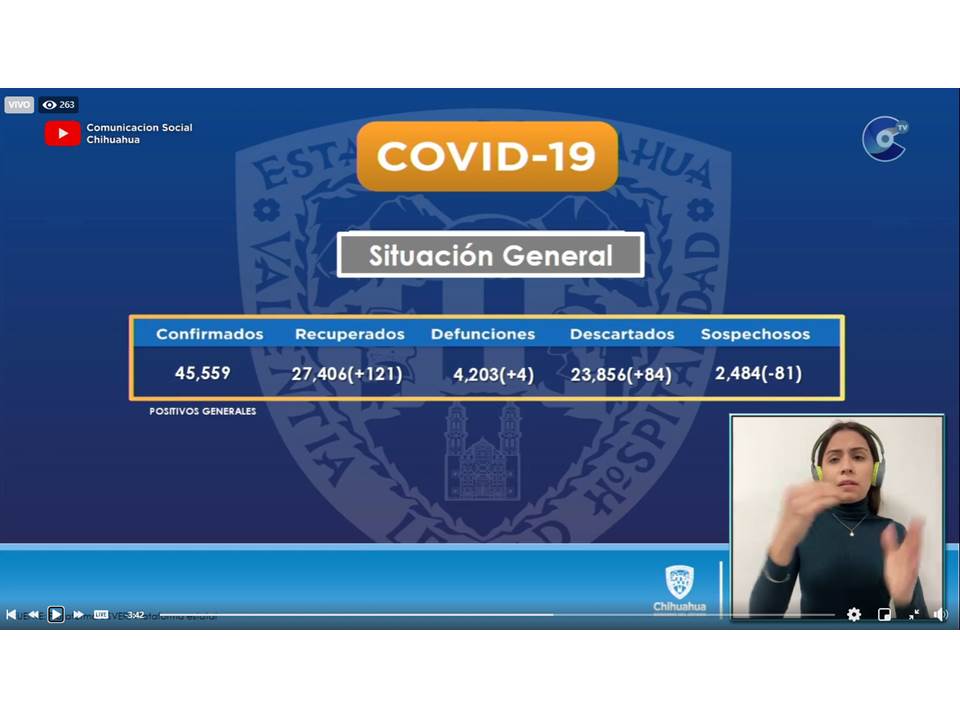 Valenzuela añadió que la entidad presenta un total general de 45 mil 559 casos confirmados, 111 en el lapso de las últimas 24 horas. Hay además 27 mil 406 recuperados (+121), otros 23 mil 856 descartados (+84) y 2 mil 484 sospechosos (-81).
