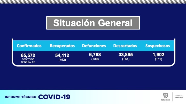 El estado de Chihuahua registró en las últimas 24 horas, el deceso de otras 30 personas a causa de la pandemia de COVID-19, con los que suman un total de 6 mil 768, de acuerdo con el reporte dado a conocer por la Secretaría de Salud.