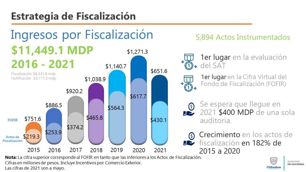 Durante 29 meses consecutivos, el estado de Chihuahua se mantiene en primer lugar nacional en materia de fiscalización, al pasar de 219 millones de pesos (mdp) que se cobraban en 2015 por auditorías fiscales, a 617 mdp en 2020.
