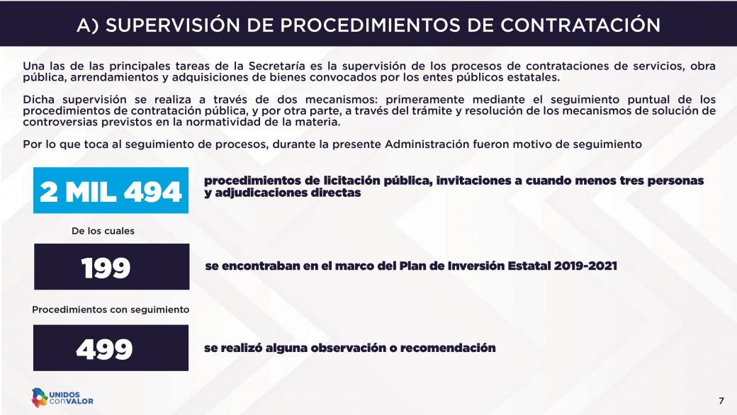 Detalló que de los 2,494 procedimientos de licitación pública, en 499 se realizó alguna observación o recomendación; se tramitaron 112 inconformidades de proveedores y contratistas e intervenciones de oficio en materia de adquisiciones y obra pública, así como 33 procedimientos de conciliación y 24 de sanción a proveedores.