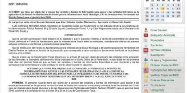 El secretario de Desarrollo Social de la Federación, Luis Enrique Miranda Nava mediante Acuerdo publicado en el Diario Oficial de la Federación de fecha 10 de enero de 2018, mismo que podrá encontrar en la siguiente liga: http://dof.gob.mx/nota_detalle.php?codigo=5510359&fecha=10/01/2018, da a conocer las variables y fuentes de información para apoyar a las entidades federativas en la aplicación de la fórmula de distribución del Fondo de Aportaciones Para la Infraestructura Social Municipal y de las demás Demarcaciones del Distrito Federal para el Ejercicio Fiscal 2018 (FISMDF 2018)