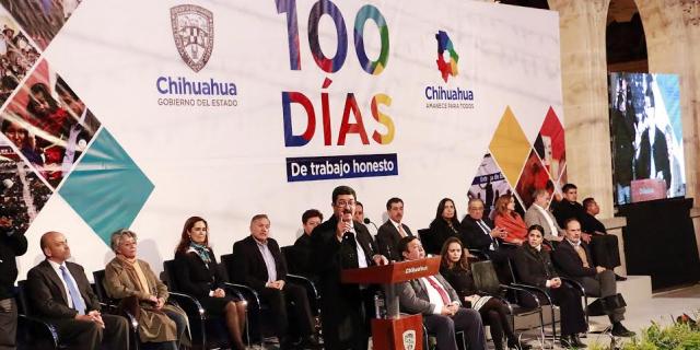 El gobernador Javier Corral presentó ante representantes de todos los sectores sociales un balance de los primeros 100 días de gobierno en el que destacó el cambio de paradigmas en materia de gasto público y ahorro de recursos, respeto a los derechos humanos, transparencia, rendición de cuentas y combate a la corrupción y la impunidad.