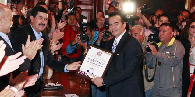 Como parte de los festejos del CVI Aniversario de la Revolución Mexicana, en ceremonia realizada en el Salón Rojo de Palacio de Gobierno, previo al desfile conmemorativo, el mandatario estatal condecoró al medallista de bronce y al entrenador, por su desempeño a nivel nacional e internacional.