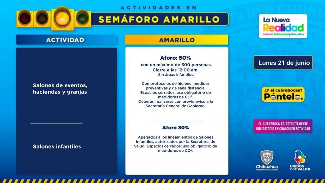 La Secretaría de Salud estatal confirmó que el estado de Chihuahua permanecerá en semáforo amarillo, durante los próximos 15 días, aunque permitirá aumento de aforos y apertura de algunas actividades que permanecían restringidas.