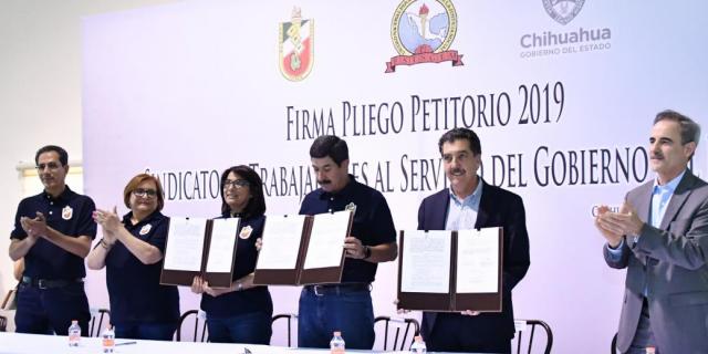 El gobernador del estado, Javier Corral Jurado, firmó el pliego petitorio del Sindicato de Trabajadores al Servicio del Gobierno del Estado de Chihuahua, que contempla un aumento del 5% en el salario, retroactivo al primero de enero de 2019 y otras prestaciones por un monto de 29 millones de pesos.