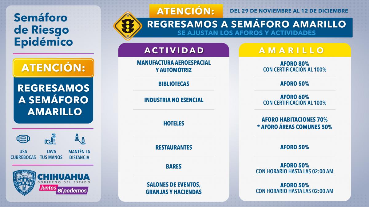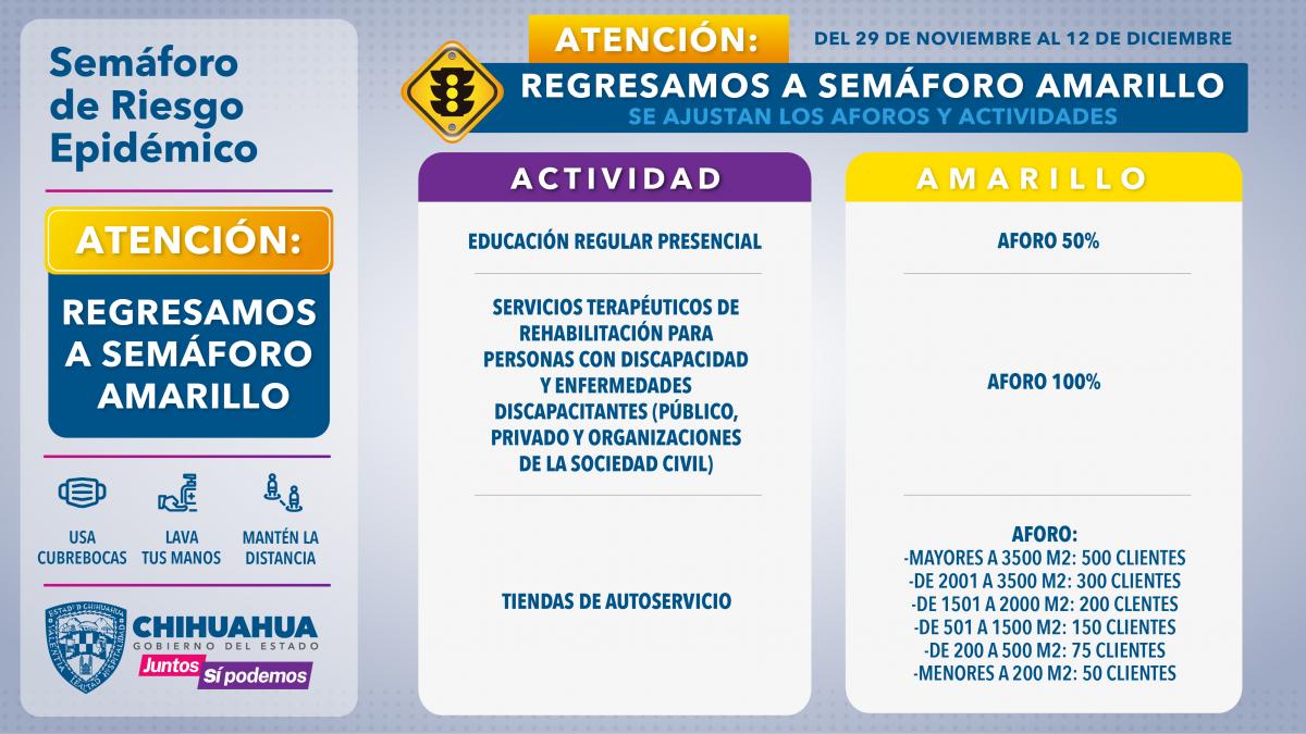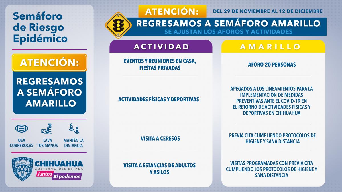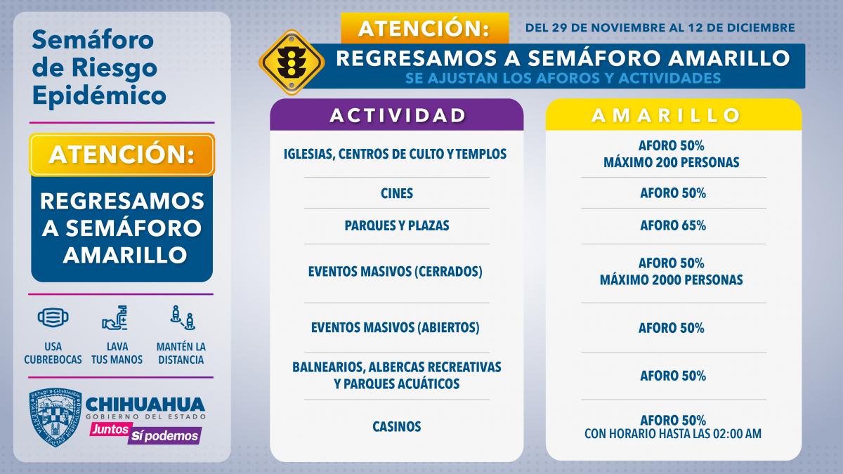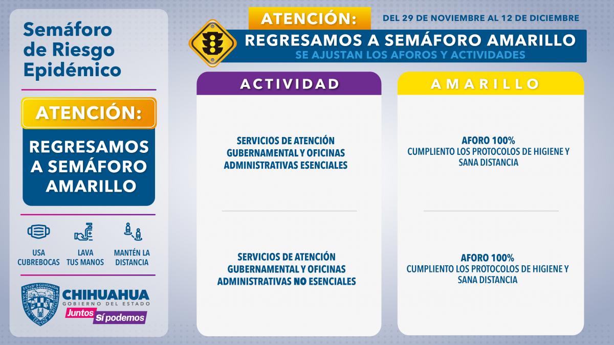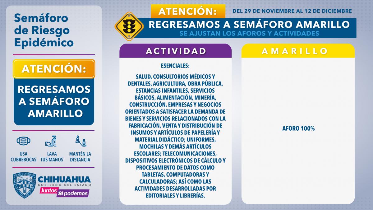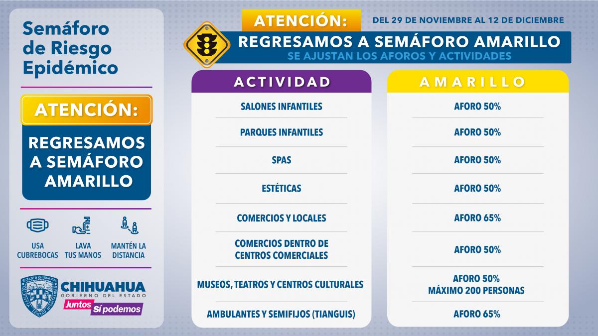 El Secretario de Salud del Estado de Chihuahua, Felipe Fernando Sandoval Magallanes, señaló que se ratificó el Semáforo Epidemiológico amarillo y recordó que permanecerá vigente hasta el día 12 de diciembre.