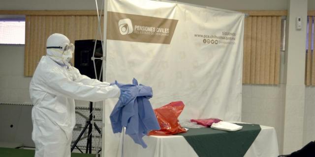 Pensiones Civiles a través de la Dirección Médica, da cumplimiento a las recomendaciones emitidas por las secretaría de Salud estatal y federal, entregando a los titulares de las delegaciones, equipos de protección especial para el personal de salud, que consta de respiradores NIOSH N95, lentes con protección lateral, bata desechable de manga larga, doble par de guantes de nitrilo, cinta microporosa, cubre zapato y la bolsa para residuos RPBI.