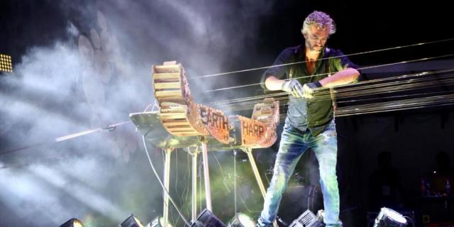 Cinco músicos en escena interpretaron violín, guitarra acústica, percusiones, la voz y por supuesto, el instrumento estelar, “el arpa de la tierra”, este peculiar e ingenioso artefacto musical creado por Close.