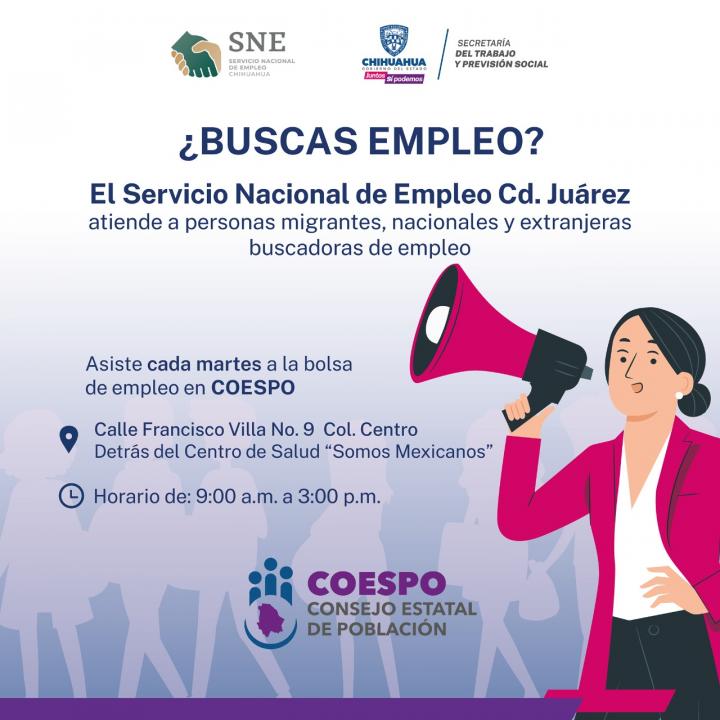 La oficina del Servicio Nacional de Empleo (SNE) en Ciudad Juárez, continúa este martes con el programa de Bolsa de Trabajo dirigida a migrantes, para que puedan vincularse con empresas que ofrecen empleos temporales y semipermanentes.