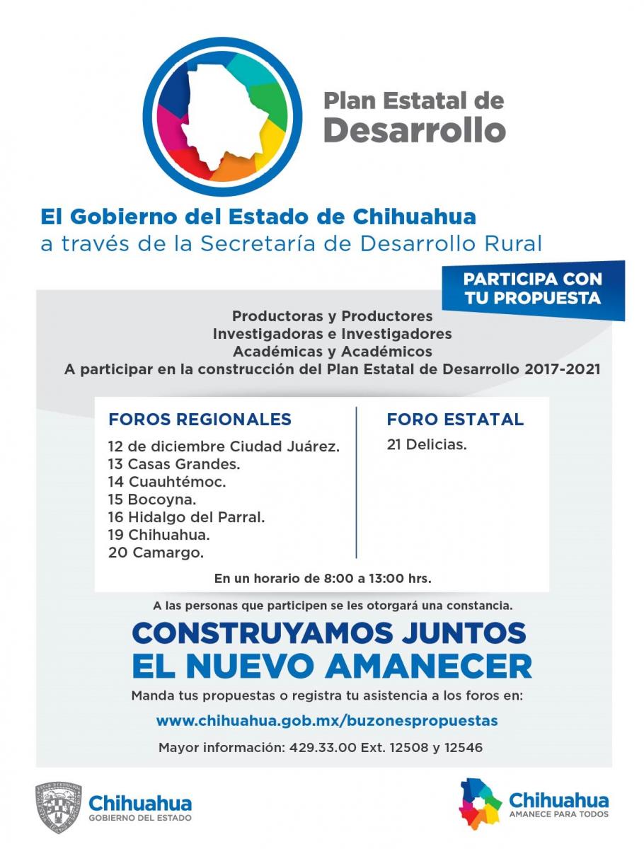 Posteriormente, estos trabajos se trasladarán al plano regional, para dar comienzo con los foros regionales el día 12 de diciembre en Ciudad Juárez, el 13 en Casas Grandes, 14 Cuauhtémoc, 15 Bocoyna, 16 Hidalgo del Parral, 19 Chihuahua, 20 Camargo y 21 en Delicias.