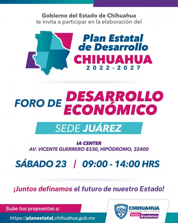 Con el propósito de generar políticas públicas que contribuyan a conformar el Plan Estatal de Desarrollo 2022-2027, la Secretaría de Innovación y Desarrollo Económico (SIDE), convoca a las y los empresarios, académicos, investigadores y público en general, a participar en modalidad virtual, en el Foro de Desarrollo Económico, que se llevarán a cabo este sábado 23 de octubre de 9 de la mañana a dos de la tarde en Ciudad Juárez.