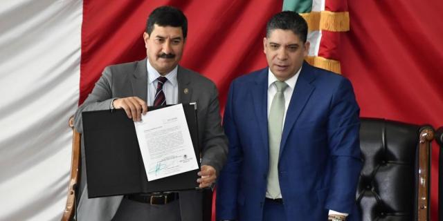 Durante la sesión solemne entregó el documento al presidente del Congreso del Estado, René Frías Bencomo, ante la presencia del presidente del Tribunal Superior de Justicia del Estado (TSJE), Pablo Héctor González Villalobos, legisladores federales, senadores, integrantes del gabinete estatal, representantes del sector empresarial y ciudadanía en general.