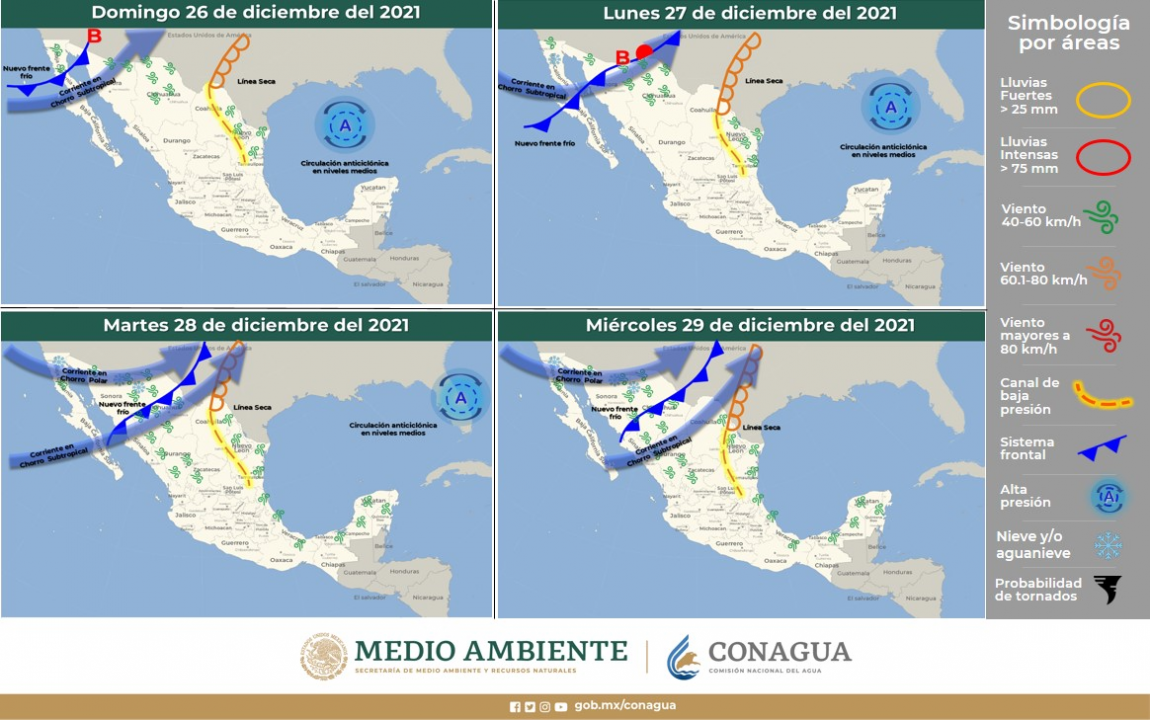 La aproximación de este sistema frontal, ocasionará desde este lunes 27 hasta el miércoles 29 de diciembre vientos fuertes de entre 50 y 75 kilómetros por hora (km/h) en Janos, Casas Grandes, Madera, Ignacio Zaragoza, Gómez Farías, Namiquipa, Bachíniva, Guerrero, Bocoyna, Carichí, Cuauhtémoc, Riva Palacio, Majalca.