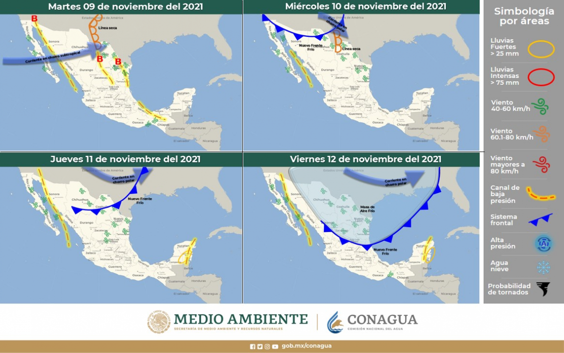 El jueves 11, el frente frío y su masa de aire asociada, en interacción con la corriente en chorro y un canal de baja presión, favorecerá un ambiente de frío a fresco por la mañana y cálido por la tarde, con temperaturas de muy frías a frías, con heladas por la mañana en parte de la Sierra; ocasionando rachas de viento de más de 45 km/h en parte de la zona norte, especialmente en Juárez; y pueden superar los 35 km/h en el noroeste.