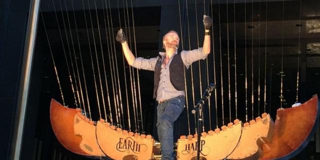 El músico estadounidense tiene el récord Guinnes por crear un arpa con cuerdas de 290.71 metros de largo y suele instalar algunas sobre su público para tocar música medioambientalista