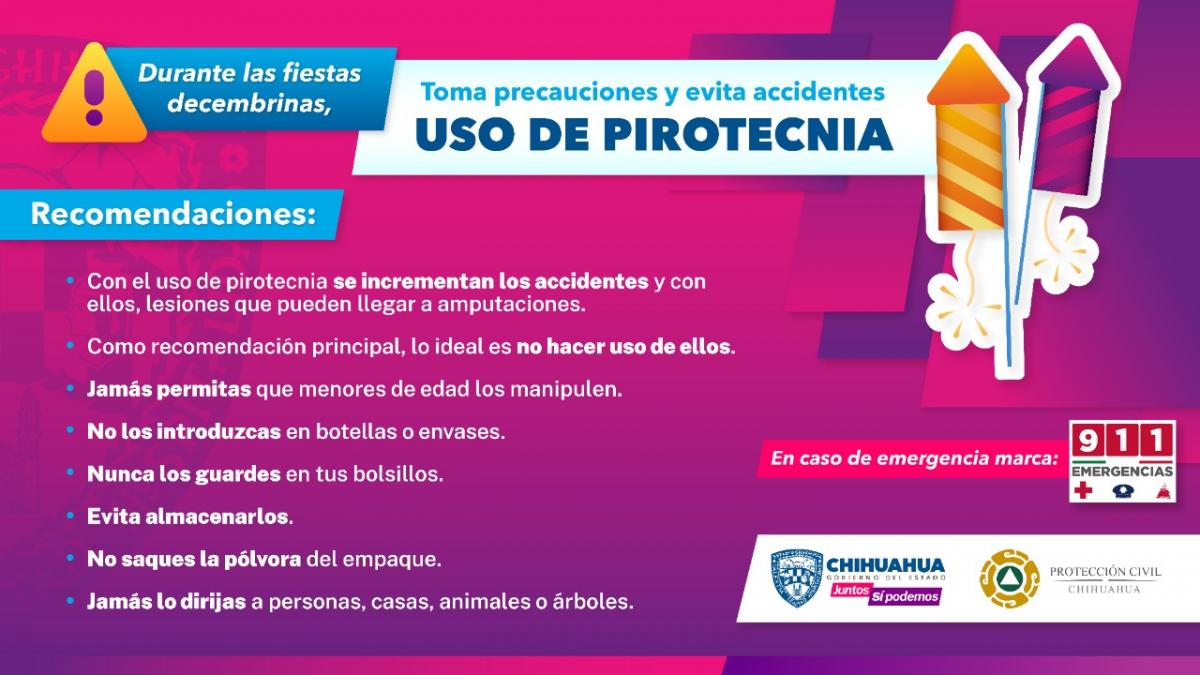 La CEPC reitera el llamado a las familias chihuahuenses a la concientización y evitar el uso de estos productos, lo cual contribuye a que se disfrute esta época con seguridad, en el marco de la prevención y el auto cuidado.