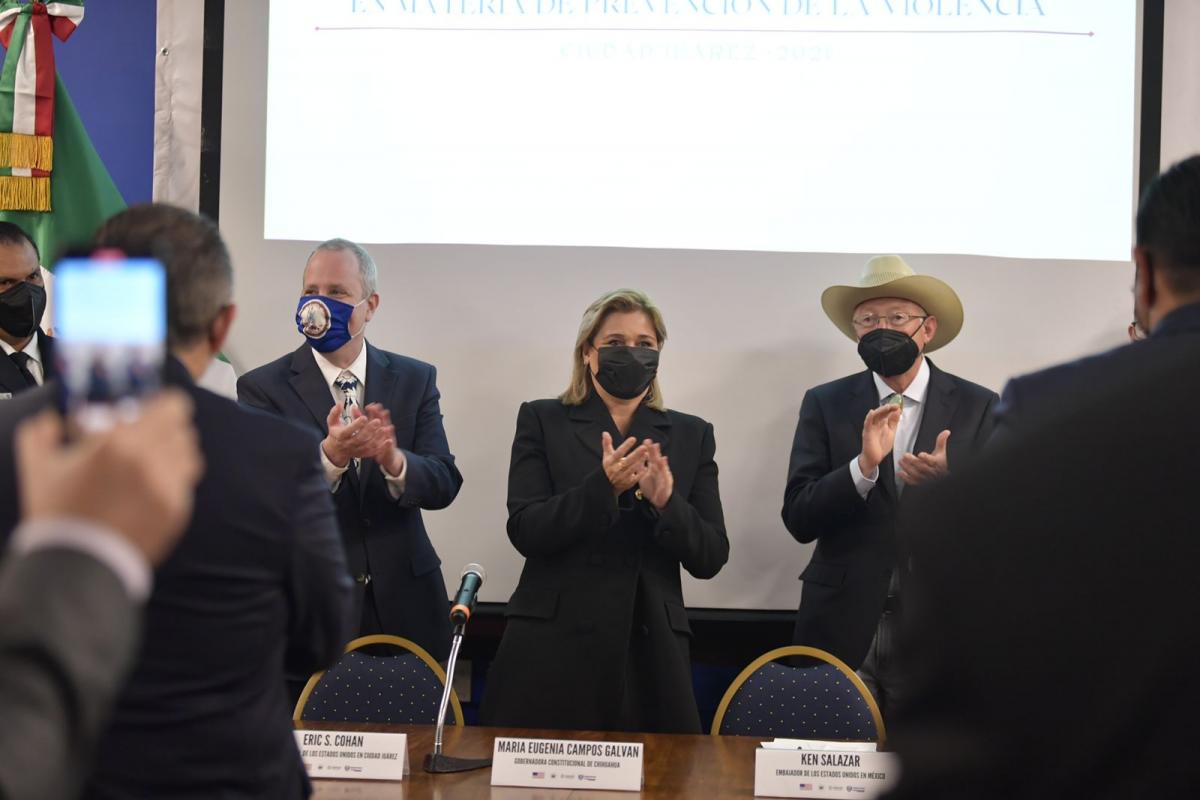Durante el evento de firma de convenio, la Gobernadora estuvo acompañada por el secretario de Seguridad Pública, Gilberto Loya; el fiscal General Roberto Fierro; Kenneth Salazar, embajador de Estados Unido en México; Eric Cohan, cónsul General de EUA en México; Bruce Abrams, director de Misión de USAID en México; además de los alcaldes del municipio de Chihuahua, Juárez, Cuauhtémoc, Delicias y Parral.