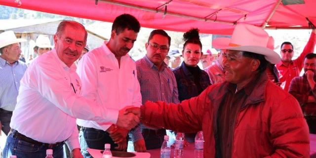 El secretario de Desarrollo Rural, Rubén Chávez Villagrán; el presidente municipal de Guadalupe y Calvo, Noel Chávez Velázquez y el recaudador de Rentas, Pedro Barrón hicieron entrega de los cheques durante los días 9 y 10 de este febrero en las localidades de Turuachi y Baborigame a personas que vieron afectadas sus cosechas por algún tipo de siniestro climático.