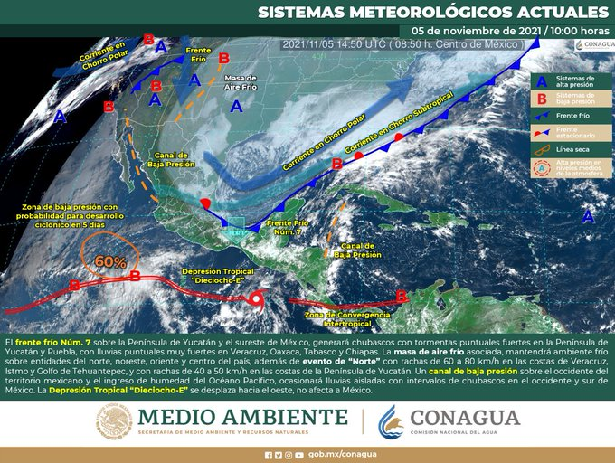 En tanto para el domingo 7, la masa de aire frío que impulsó al frente frío número 7 en interacción de la corriente en chorro y un canal de baja presión favorecerá ambiente de frío a fresco por la mañana y poco caluroso por la tarde, temperaturas muy frías con heladas por la mañana con mayor incidencia sobre la zona serrana, con un cielo de despejado a parcialmente nublado.