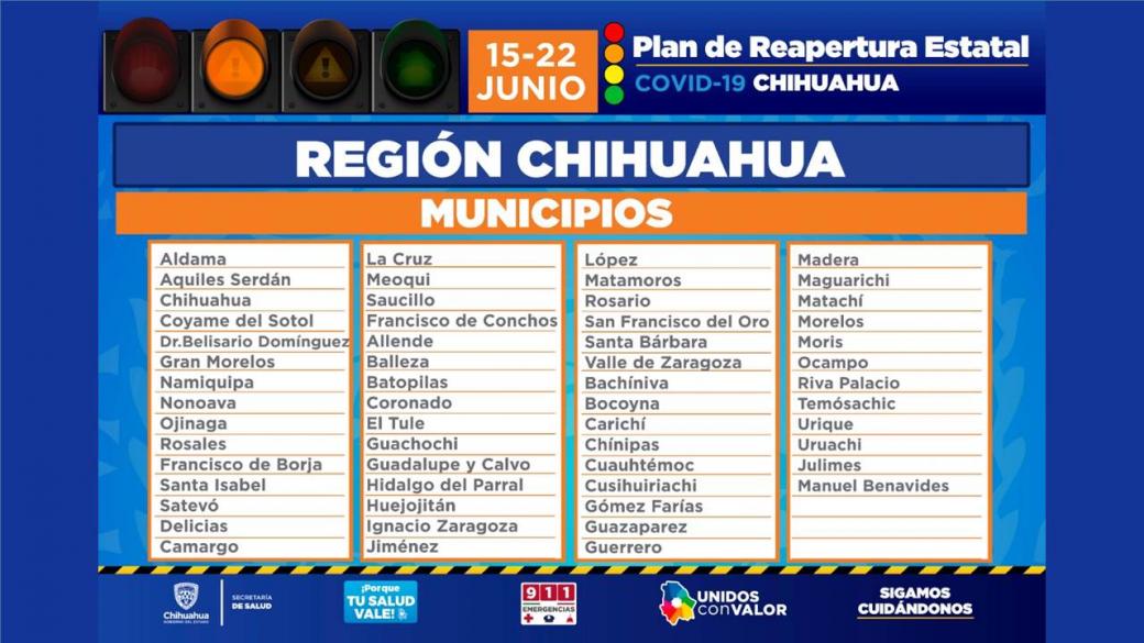 La reapertura paulatina y escalonada de actividades en la entidad inició a partir de este lunes 15 de junio, una vez que el Gobierno Federal aprobó la semaforización regional con base en el comportamiento diferenciado de contagios de COVID-19, lo que permitió a la Región Chihuahua (con la capital y otros 56 municipios del centro y sur del estado) pasar al semáforo naranja.