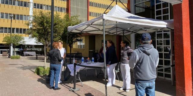 En los filtros, personal de enfermería aplica a derechohabientes, personal y público en general la toma de temperatura y gel antibacterial, además entrega volantes con información sobre los signos y síntomas del padecimiento, así como las medidas preventivas a realizar ante un caso sospechoso.