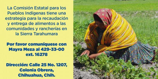 La Comisión Estatal para los Pueblos Indígenas (Coepi) del Gobierno del Estado de Chihuahua, dentro de sus estrategias para atender las necesidades de comunidades, rancherías y localidades de la Sierra Tarahumara dispone de un equipo que recauda y entrega alimentos a quienes más los necesitan.