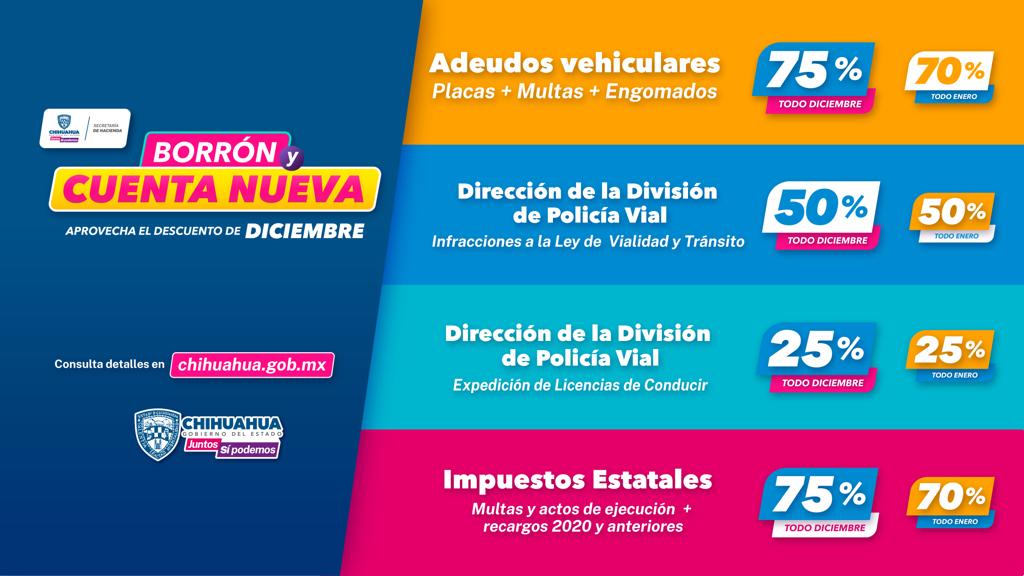 El Gobierno del Estado, recuerda a la ciudadanía que continúa vigente el programa “Borrón y Cuenta Nueva” con el cual pueden obtener descuentos de hasta el 75% durante el mes de diciembre y enero en adeudos vehiculares, expedición de licencias de conducir, impuestos estatales e infracciones de tránsito.