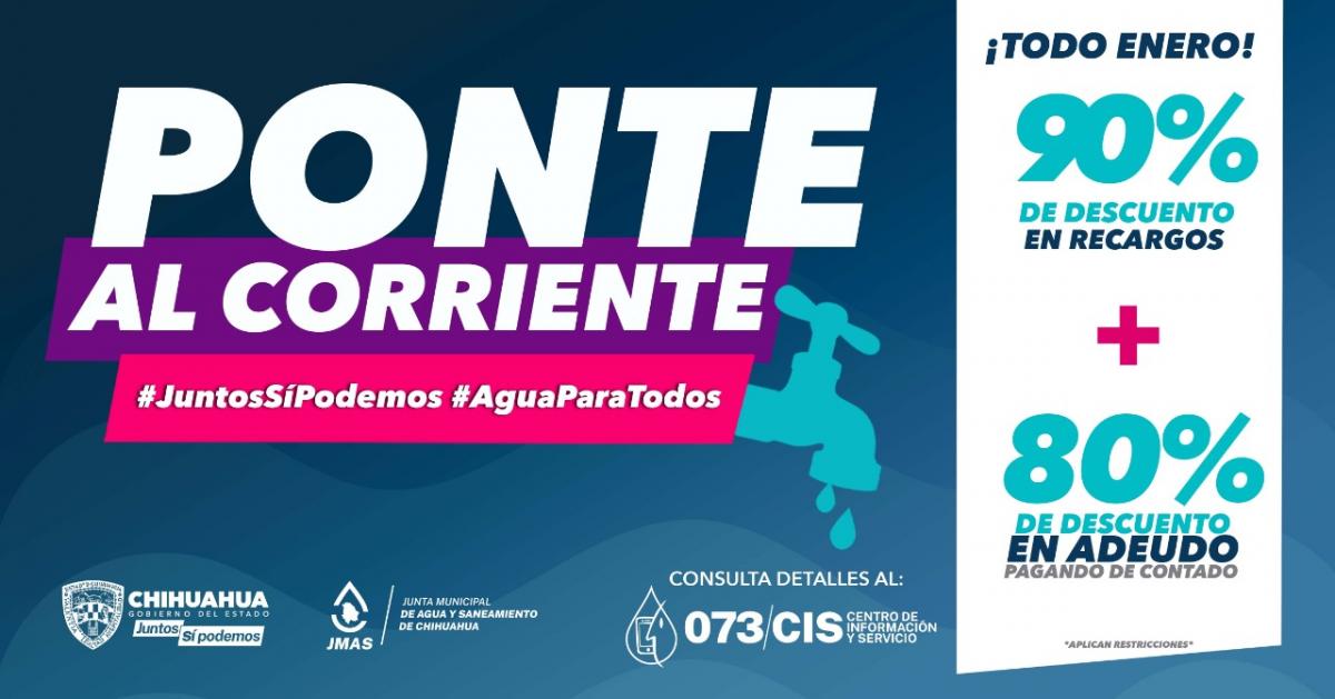 Gobierno del Estado, a través de la Junta Municipal de Agua y Saneamiento (JMAS) de Chihuahua, invita a quienes tienen algún adeudo por el servicio de agua potable para que aprovechen los beneficios del programa “Ponte al Corriente” que estará vigente durante todo el mes de enero, con descuentos del 90% en recargos y del 80% en el adeudo al pagar de contado.