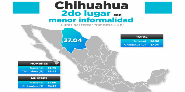 La Encuesta Nacional de Ocupación y Empleo (ENOE) del tercer trimestre de este año, ubica a Chihuahua con un 37.04 por ciento en las tasas de informalidad, el segundo mejor porcentaje del país y muy lejos del 56.5 por ciento, que es la media nacional.