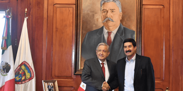 El mandatario chihuahuense recibió a López Obrador en las escalinatas del histórico inmueble, sobre la calle Libertad de la capital del estado, en donde ambos se abrazaron y posaron para los medios de comunicación.